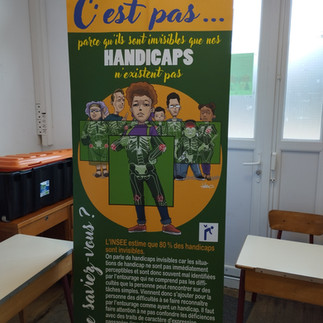 Dernière création de l’association YA FOUEI, « Juste une exposition sur le handicap » s'est installée à l'école élémentaire pendant 2 jours. Cette Expo Quiz de 9 panneaux Grand format (200 X 85 cm) a mis en lumière, de manière dédramatisée, la thématique du handicap qui touche en France plus de 11 millions de personnes.